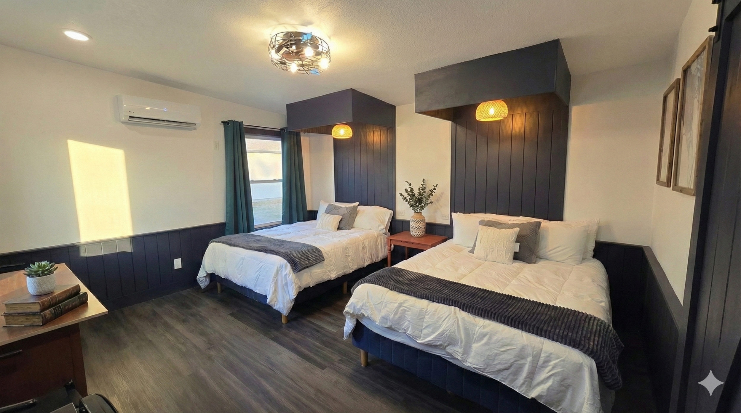 Large bunkroom with separate living area and full bathroom